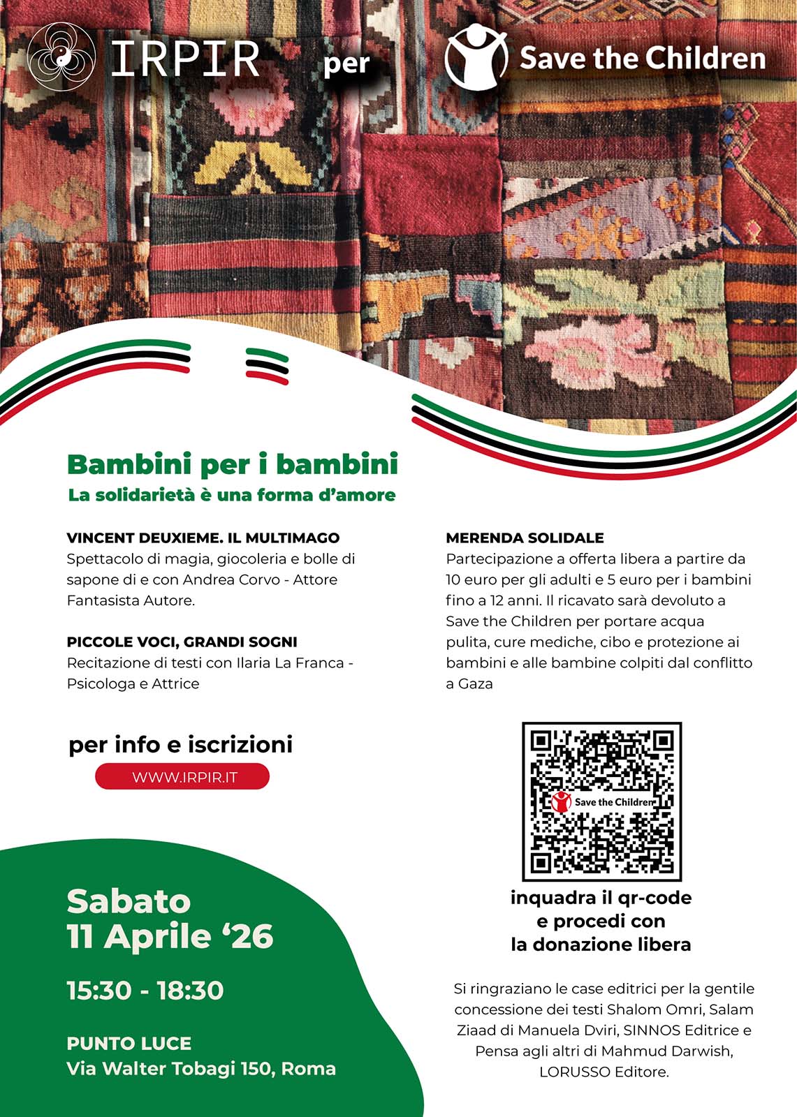 Partecipazione a offerta libera a partire da 10 euro per gli adulti e 5 euro per i bambini fino a 12 anni. Il ricavato sarà devoluto a Save the Children per portare acqua pulita, cure mediche, cibo e protezione ai bambini e alle bambine colpiti dal conflitto a Gaza